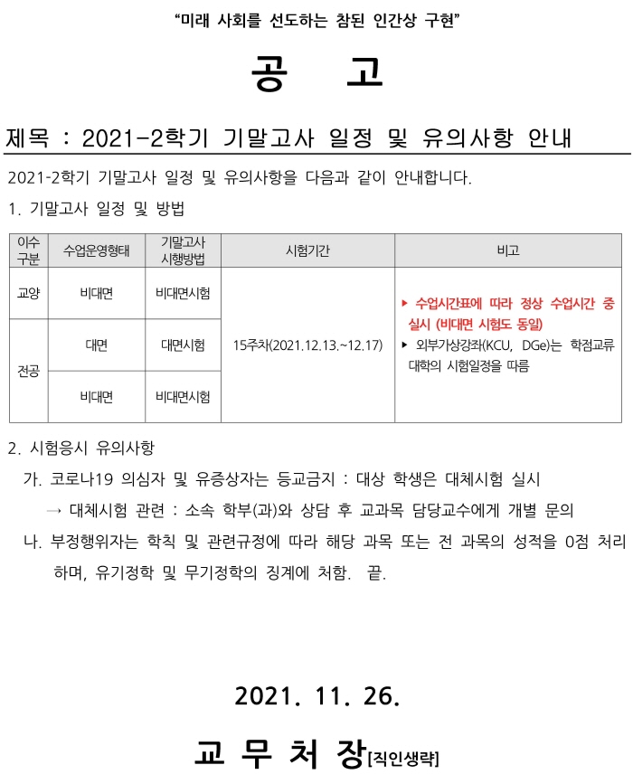 2021-2학기 기말고사 일정 및 유의사항 안내